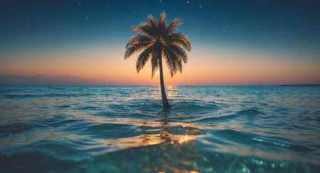 AI Generated. Serene underwater split shot of a lone palm tree in tranquil waters during twilight hours