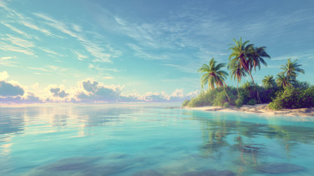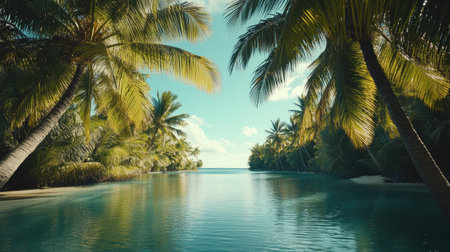 Tropical paradise with coconut trees leaning over tranquil waters, copy space