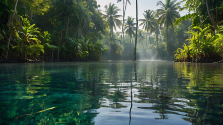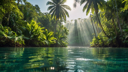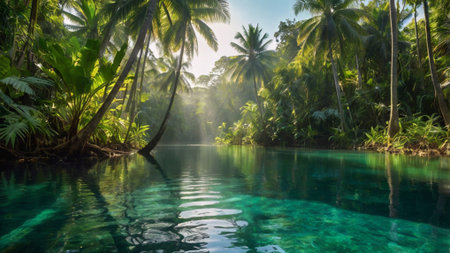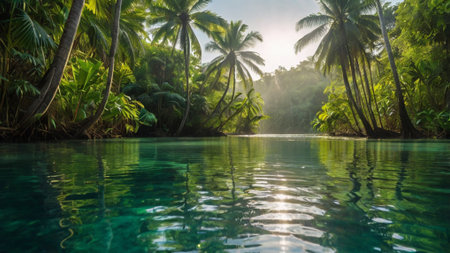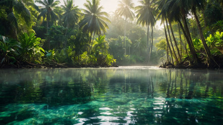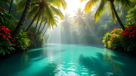 A serene lagoon surrounded by vibrant tropical plants and soft sunlight filtering through