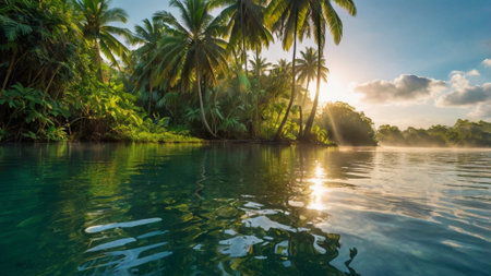 Tropical Paradise: Tranquil Waterside Oasis with Lush Green Coconut Trees
