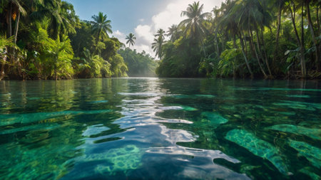 Experience the serene beauty of a tropical oasis featuring lush greenery, crystal clear water, and swaying palm trees under a sunlit sky.