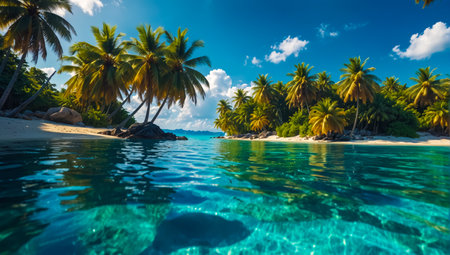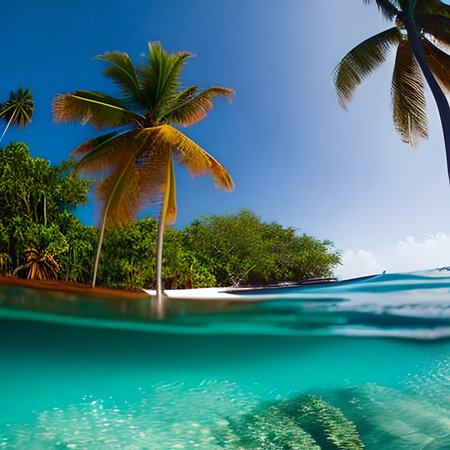 Idyllic tropical coastline, turquoise waters, palm trees, and underwater beauty generated by artificial intelligence