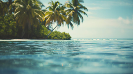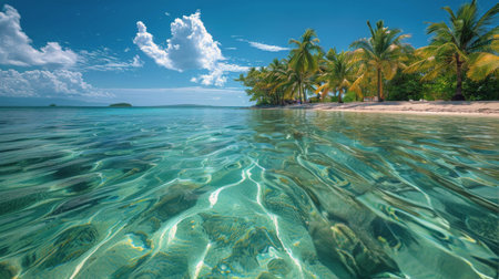 Experience the tranquility of a tropical paradise with crystal clear waters, vibrant palm trees, and a stunning blue sky, perfect for vacation and relaxation.