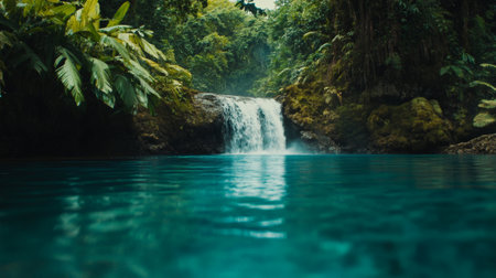 Crystal clear turquoise water flows gently in a jungle pond, fed by a cascading waterfall surrounded by vibrant green vegetation, creating a serene and idyllic natural landscape