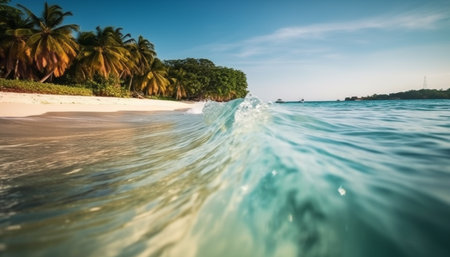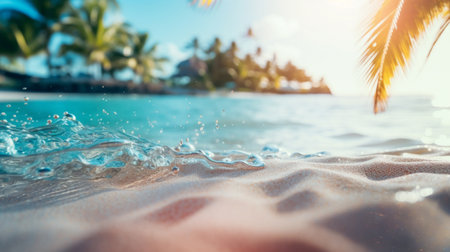 Close-up of clear sea water with sandy beach background, palm trees, and sunny sky, invoking a tropical paradise.