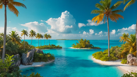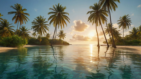 Tranquil tropical paradise with palm trees, crystal clear water, and sunny skies, perfect for relaxation and beachfront adventures