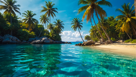 Discover a stunning tropical landscape featuring clear blue water, lush palm trees, and rocky shores, creating a perfect escape to a serene beach paradise.