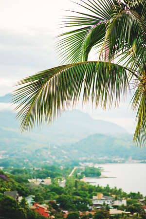 The branches of coconut palms against tropical landscape