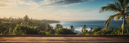 A Wooden Platform overlooking Beautiful Beach and Sea Scenery, Serene view, mockup with copy space.