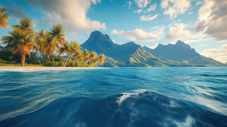A breathtaking view of a tropical landscape featuring lush palm trees, crystal clear turquoise water, and majestic mountains in the background, inviting tranquility.
