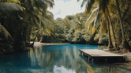 Experience the serene beauty of a tropical oasis featuring lush greenery, crystal clear water, and swaying palm trees under a sunlit sky.