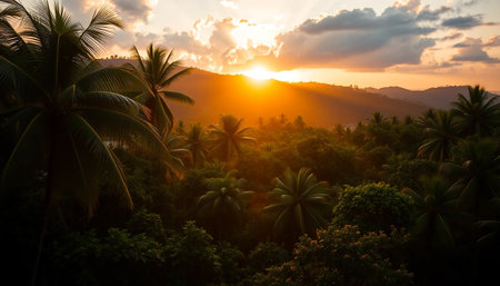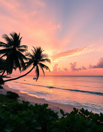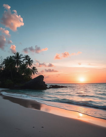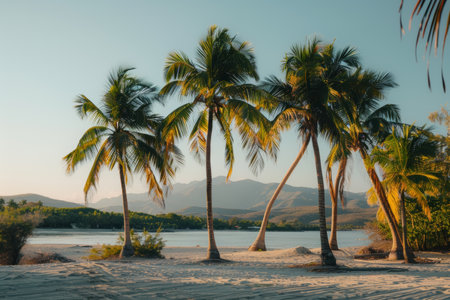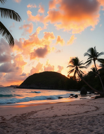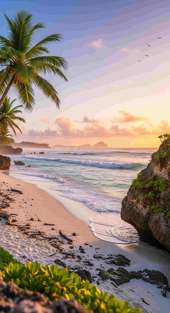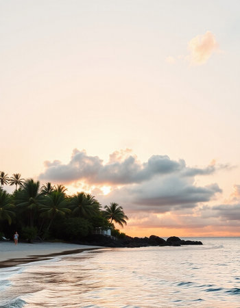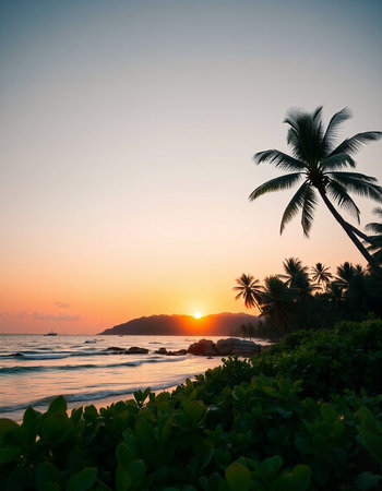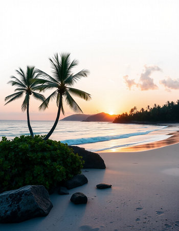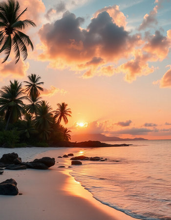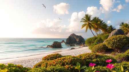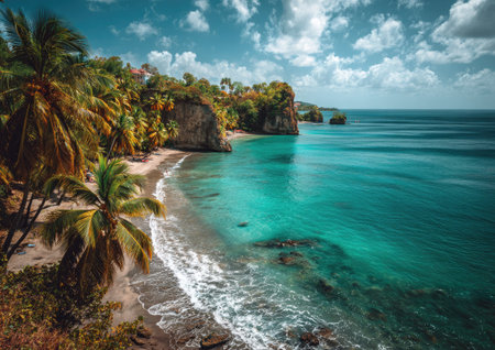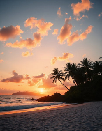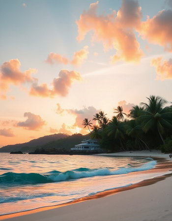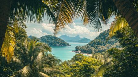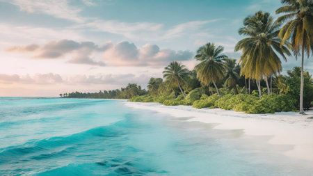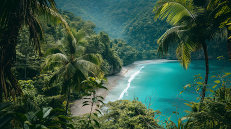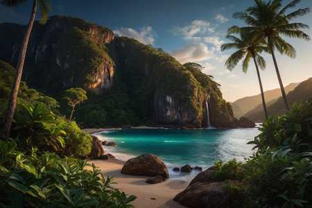 Tranquil and serene tropical beach paradise with secluded sandy beaches, lush greenery, and palm trees for a perfect vacation destination
