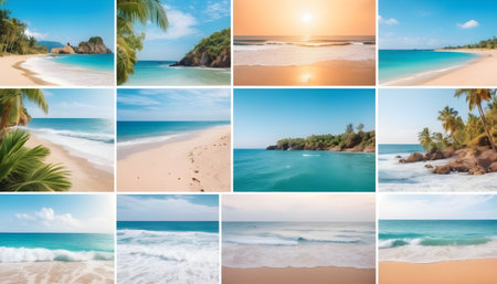 Beatiful sea coast view collage with sand, ocean and waves. Idellyc paradise place pictures set with holiday tropical vibes