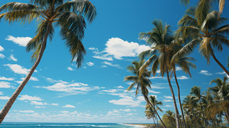 A tropical heaven with palm trees, white sandy shorelines, and crystal-clear waters. Creative resource, AI Generated