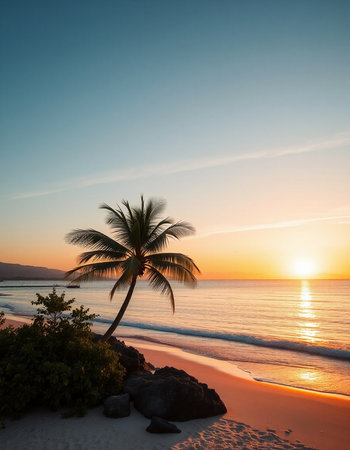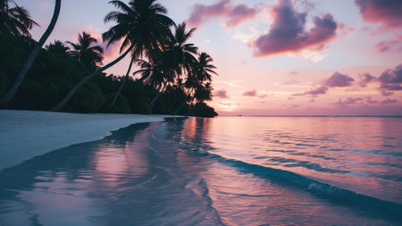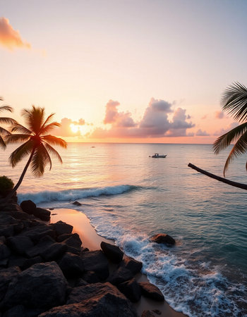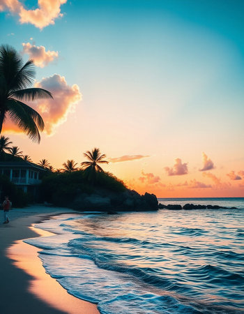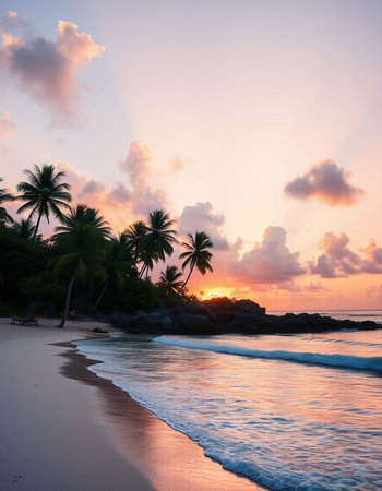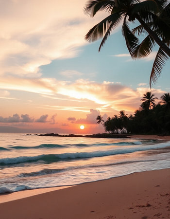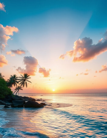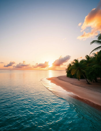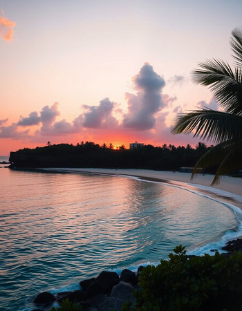 Soft sand stretches along the shore as palm trees sway gently in the warm breeze.