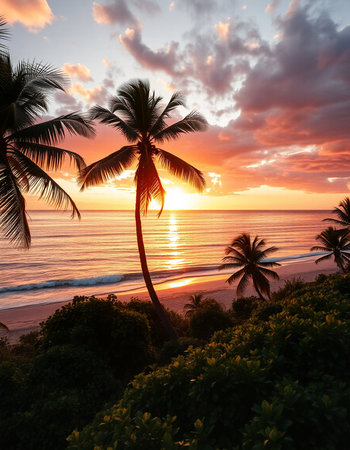 A breathtaking sunset casts vibrant colors across the sky and reflects on the calm ocean waves. Silhouetted palm trees frame the serene beach, creating a picturesque scene.