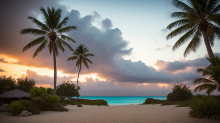 Sunset on the beach with palm trees and turquoise water