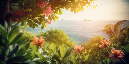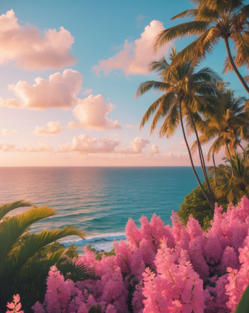AI Generated. Tropical Sunset Paradise Pink Flowers Palm Trees Ocean View