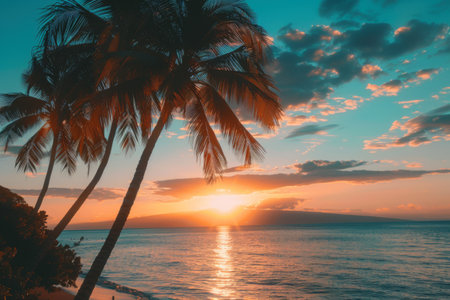 Golden sunset over a tropical beach with leaning palm trees and gentle waves, creating a tranquil and idyllic seascape.