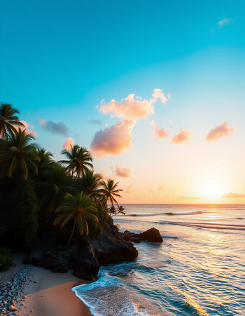 Golden sand stretches along the shore, where gentle waves lap at the beach. Palm trees sway in the warm breeze under a clear blue sky, creating a serene tropical atmosphere.