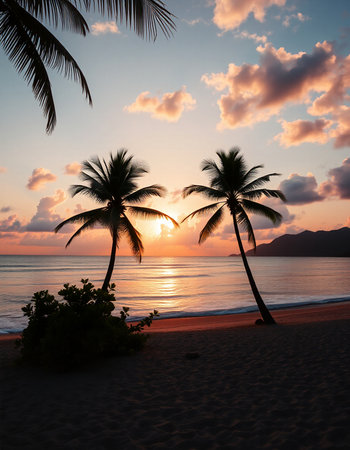 Palm Tree Paradise, Sunset Glow on the Seashore
