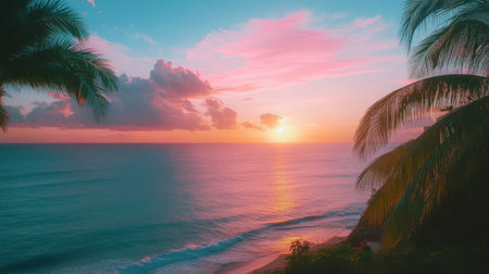 Experience the beauty of a vibrant sunset over a tranquil ocean, with silhouetted palm trees framing the colorful sky. A perfect tropical scene for relaxation and travel inspiration.