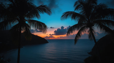 Experience a captivating sunset casting vibrant colors over the Caribbean Sea, with silhouetted palm trees enhancing the tranquil atmosphere of Deshaies, Guadeloupe.