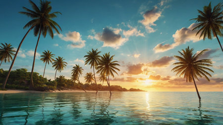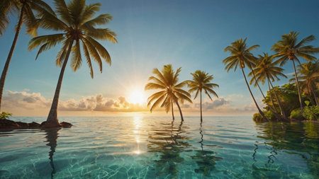 A stunning tropical beach scene featuring clear water, swaying palm trees, and a bright sun overhead. This serene landscape captures the essence of paradise and relaxation.