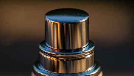 Golden perfume spray cap on light background close up with copy space.