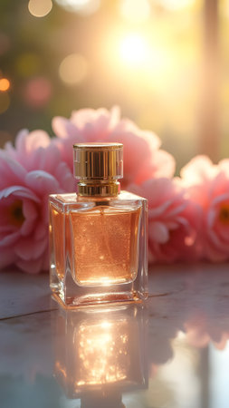 A clear glass perfume bottle sits on a dark background, its amber liquid shimmering like sunlight. The bottle is surrounded by delicate pink flowers, their petals soft and velvety. The scene is both elegant and serene, suggesting a fragrance that is as beautiful as the blossoms that surround it.