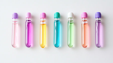 Eight colorful test tubes filled with various liquid samples showcase a vibrant palette. This image highlights creativity and is perfect for scientific or artistic purposes.