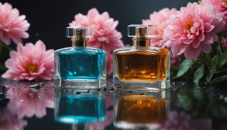 bottle of male and female perfume, on a wooden table, on a floral mirror background. The concept of spring fragrance. Promotional perfume photo