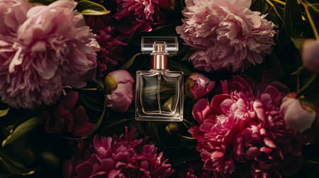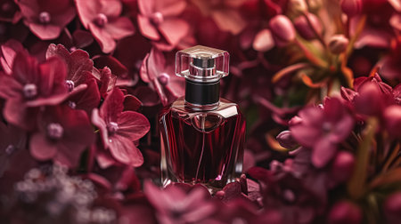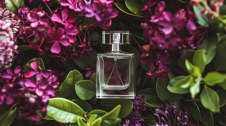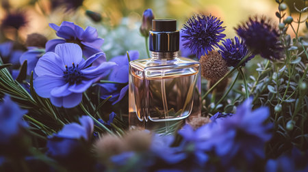 This striking image features an elegant glass perfume bottle adorned with vibrant flowers, set against a soft bokeh background. The serene colors create an enchanting atmosphere, perfect for beauty or lifestyle themes.