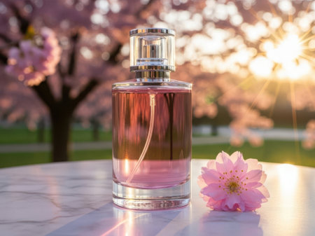 A sleek perfume bottle with a pink hue sits on a marble surface in a serene garden setting. The background is adorned with blooming cherry blossom trees, creating a picturesque and tranquil atmosphere. A delicate pink flower rests beside the perfume, enhancing the overall aesthetic.