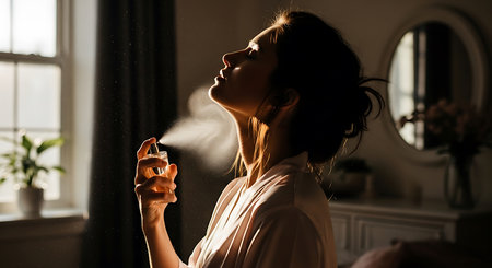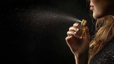 A close-up of a woman spraying a fine mist of perfume onto her wrist, emphasizing the elegance of fragrance application in a stylish,