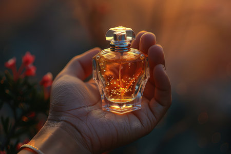Hand holding delicate perfume bottle. In the palm of a hand, a captivating perfume bottle rests, radiating an aura of sophistication and refinement.