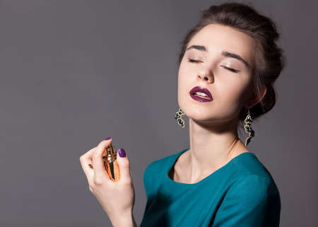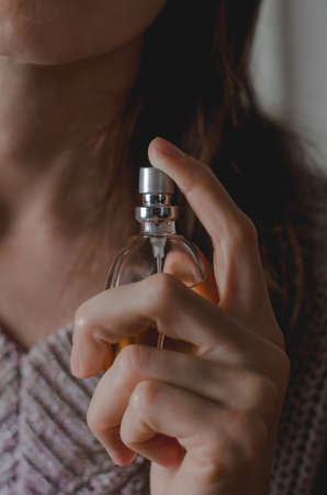 Beautiful young woman with a bottle of perfume in her hand. Perfume in female hands.