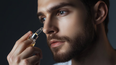 A man applying facial serum indoors while preparing for skincare routine at home in the evening light