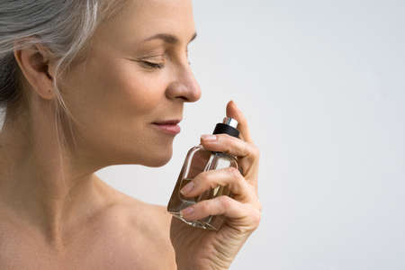 Senior woman without clothes smells perfume isolated on light grey