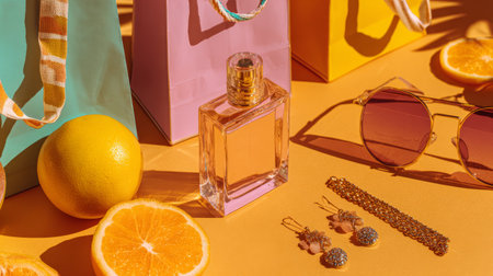 Trendy summer shopping theme, warm sunlight, designer perfume, shopping bags, citrus fruits, jewelry and sunglasses, vibrant pastel aesthetic