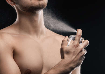 Young man applying perfume on black background, closeup