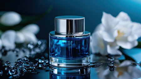 A striking blue glass container is adorned with shimmering crystals and surrounded by delicate white flowers on a reflective surface, creating an atmosphere of luxury and sophistication.
