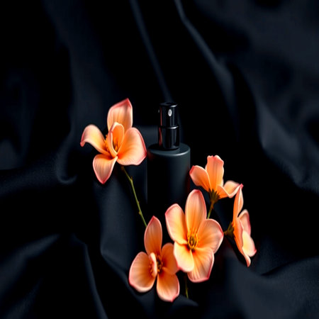 Bottle of perfume and flowers on black fabric background. Top view.