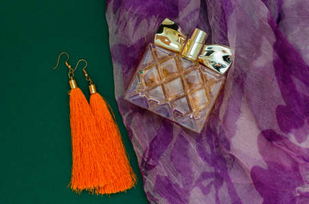 Women's perfume and bright orange earrings-tassels on a paper green background. Female beauty concept.