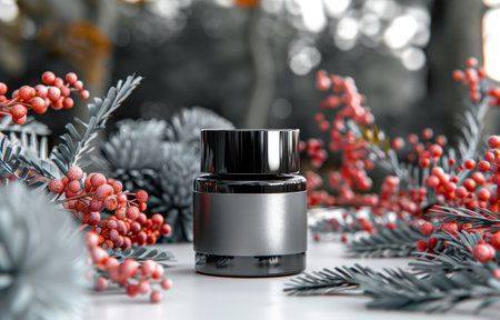 A sleek black and silver cosmetic jar placed amidst vibrant red berries and pine branches, creating a festive and elegant atmosphere.