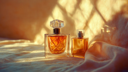 Two exquisite perfume bottles rest elegantly on a soft fabric, illuminated by warm golden sunlight, creating a serene and luxurious atmosphere, inviting a closer look at their beauty.