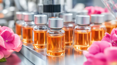 This image features elegant glass perfume bottles filled with a warm amber liquid, arranged on a sleek production line, accented by bright pink flowers.