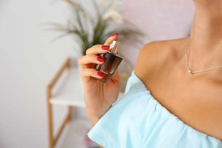 Woman with bottle of perfume at home