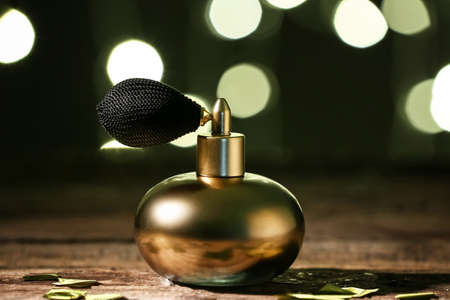 Bottle of perfume on table against blurred lights