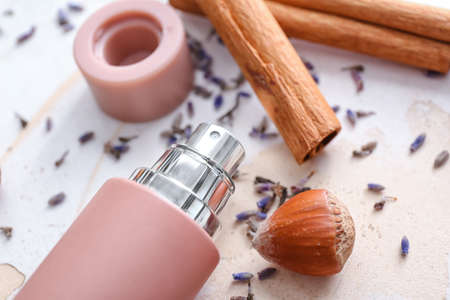 Composition with bottle of perfume on light background